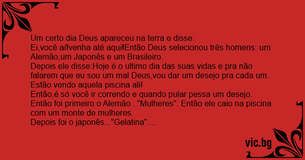 Ei,você aí!venha até aqui!Então Deus selecionou três homens: um Alemão,um Japonês e um Brasileiro.