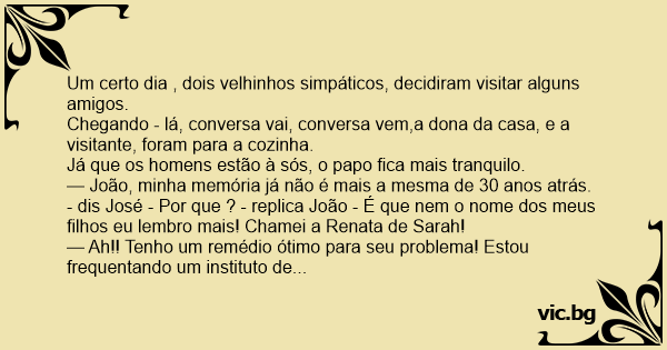 — João, minha memória já não é mais a mesma de 30 anos atrás. - dis José - Por que ? - replica João - É que nem o nome dos meus filhos eu lembro mais! Chamei a Renata de Sarah!