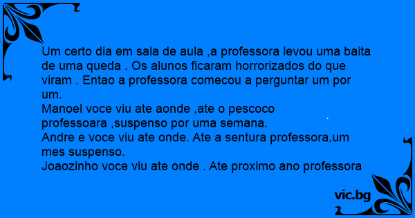 Um certo dia em sala de aula ,a professora levou uma baita de uma queda . Os alunos ficaram horrorizados do que viram . Entao a professora comecou a perguntar um por um.