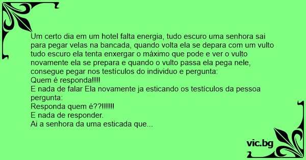 Um certo dia em um hotel falta energia, tudo escuro uma senhora sai para pegar velas na bancada, quando volta ela se depara com um vulto tudo escuro ela tenta enxergar o máximo que pode e ver o vulto novamente ela se prepara e quando o vulto passa ela pega nele, consegue pegar nos testículos do individuo e pergunta: