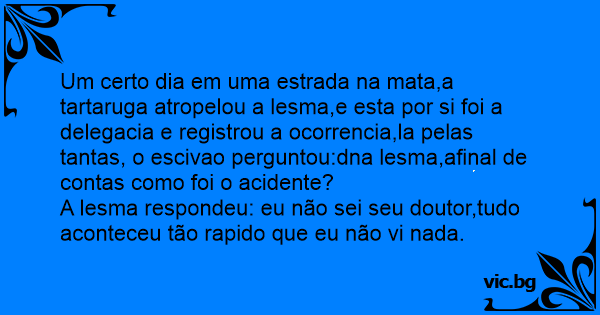 Um certo dia em uma estrada na mata,a tartaruga atropelou a lesma,e esta por si foi a delegacia e registrou a ocorrencia,la pelas tantas, o escivao perguntou:dna lesma,afinal de contas como foi o acidente?