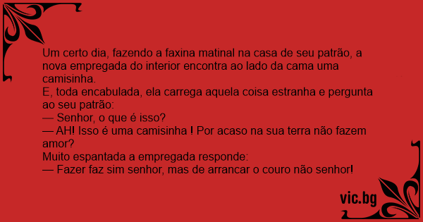 Um certo dia, fazendo a faxina matinal na casa de seu patrão, a nova empregada do interior encontra ao lado da cama uma camisinha.