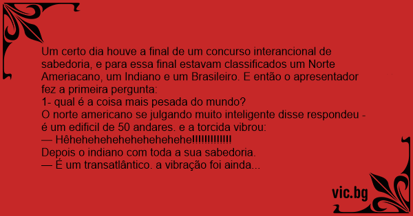 Um certo dia houve a final de um concurso interancional de sabedoria, e para essa final estavam classificados um Norte Ameriacano, um Indiano e um Brasileiro. E então o apresentador fez a primeira pergunta:
