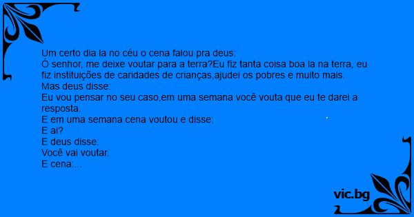 Ó senhor, me deixe voutar para a terra?Eu fiz tanta coisa boa la na terra, eu fiz instituições de caridades de crianças,ajudei os pobres e muito mais.