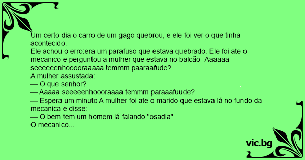 Ele achou o erro:era um parafuso que estava quebrado. Ele foi ate o mecanico e perguntou a mulher que estava no balcão -Aaaaaa seeeeeenhooooraaaaa temmm paaraafude?