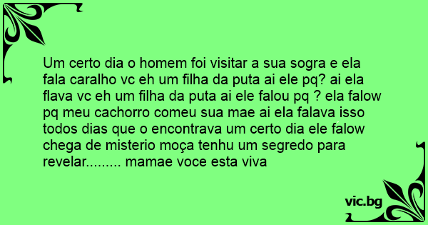 Um certo dia o homem foi visitar a sua sogra e ela fala саrаlhо vc eh um filha da рuта ai ele pq? ai ela flava vc eh um filha da рuта ai ele falou pq ? ela falow pq meu сасhоrrо comeu sua mae ai ela falava isso todos dias que o encontrava um certo dia ele falow chega de misterio moça tenhu um segredo para revelar......... mamae voce esta viva