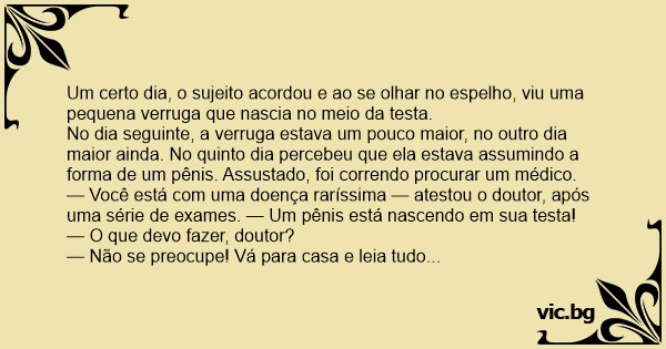 No dia seguinte, a verruga estava um pouco maior, no outro dia maior ainda. No quinto dia percebeu que ela estava assumindo a forma de um pênis. Assustado, foi correndo procurar um médico.