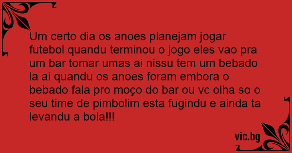 Um certo dia os anoes planejam jogar futebol quandu terminou o jogo eles vao pra um bar tomar umas ai nissu tem um bebado la ai quandu os anoes foram embora o bebado fala pro moço do bar ou vc olha so o seu time de pimbolim esta fugindu e ainda ta levandu a bola!!!