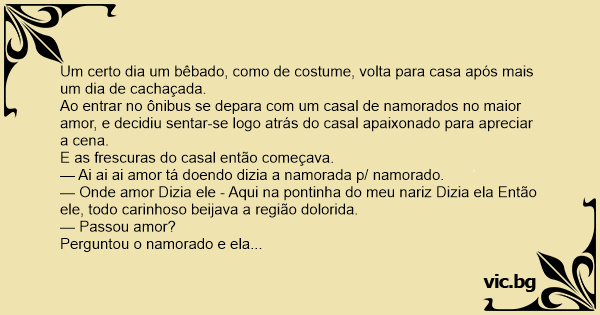 Então o bêbado já tocado de tanta frescura levantou-se subitamente e meio cambaleando perguntou p/ namorado: