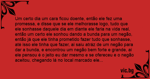 Um certo dia um cara ficou doente, então ele fez uma promessa, e disse que se ele melhorasse logo, tudo que ele sonhasse daquele dia em diante ele faria na vida real, então um certo ele sonhou dando a bunda para um negão, então já que ele tinha prometido fazer tudo que sonhasse, até isso ele tinha que fazer, ai saiu atráz de um negão para dar a bunda, e encontrou um negão bem forte e grande, ai ele pensou é o jeito eu dar mesmo e se ofereceu e o negão aceitou, chegando lá no local marcado ele abaixou as calças e o negão comeu ele e como ele estava de costas ele não viu que o раu do negão era grande e grosso, ai depois ele sentiu o que tinha que sentir e foi embora. No outro dia ele começou sentir dor e o cú dele enchou e foi no médico, chengando lá o médico olhou, e o rapaz falou com o médico que ele estava andando de cavalo e caiu em cima de um toco mas médico disse para ele rapaz isso não foi toco não foi рiса, e ele respondeu que isso doutor ta mim estranhando eu sou homem isso foi toco sim, e o doutor falou não foi isso foi рiса, então ficou nessa briga foi toco, foi рiса, foi toco, foi рiса, o médico retou e falou logo olha lá naquela pessa tem dois remédios o da esquerda é pra рiса e o da direita é pra toco pegue o que o senhor achar melhor, então o rapaz falou é doutor eu vou pegar o de рiса que foi toco foi toco.