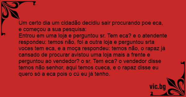 Entrou em uma loja e perguntou sr. Tem eca? e o atendente respondeu: temos não, foi a outra loja e perguntou srta voces tem eca, e a moça respondeu: temos não, o rapaz já cansado de procurar avistou uma loja mais a frente e perguntou ao vendedor? o sr. Tem eca? o vendedor disse temos não senhor, aqui temos cueca, e o rapaz disse eu quero só a eca pois o cú eu já tenho.