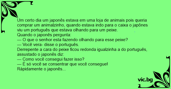 Um certo dia um japonês estava em uma loja de animais pois queria comprar um animalzinho, quando estava indo para o caixa o japônes viu um português que estava olhando para um peixe.