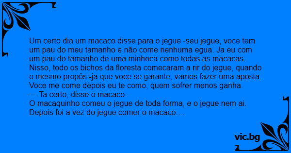 Um certo dia um macaco disse para o jegue -seu jegue, voce tem um раu do meu tamanho e não come nenhuma egua. Ja eu com um раu do tamanho de uma minhoca como todas as macacas.