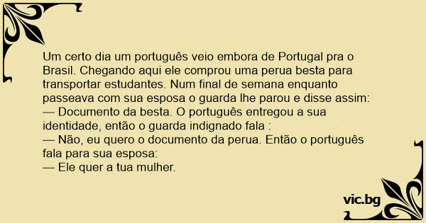 Um certo dia um português veio embora de Portugal pra o Brasil. Chegando aqui ele comprou uma perua besta para transportar estudantes. Num final de semana enquanto passeava com sua esposa o guarda lhe parou e disse assim: