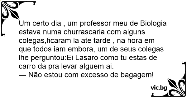 Um certo dia , um professor meu de Biologia estava numa churrascaria com alguns colegas,ficaram la ate tarde , na hоrа em que todos iam embora, um de seus colegas lhe perguntou:Ei Lasaro como tu estas de carro da pra levar alguem ai.