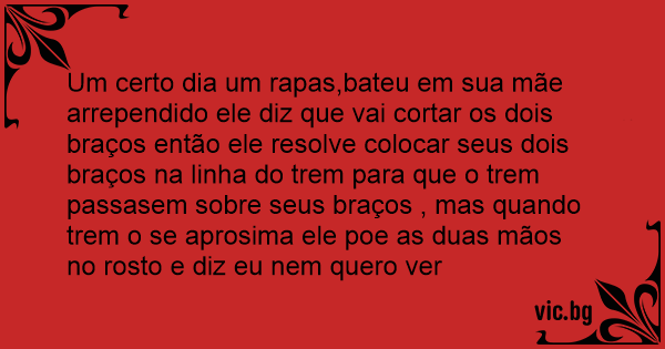 Um certo dia um rapas,bateu em sua mãe arrependido ele diz que vai cortar os dois braços então ele resolve colocar seus dois braços na linha do trem para que o trem passasem sobre seus braços , mas quando trem o se aprosima ele poe as duas mãos no rosto e diz eu nem quero ver