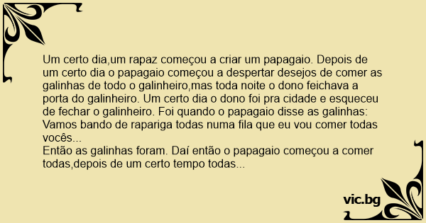 Um certo dia,um rapaz começou a criar um papagaio. Depois de um certo dia o papagaio começou a despertar desejos de comer as galinhas de todo o galinheiro,mas toda noite o dono feichava a porta do galinheiro. Um certo dia o dono foi pra cidade e esqueceu de fechar o galinheiro. Foi quando o papagaio disse as galinhas:
