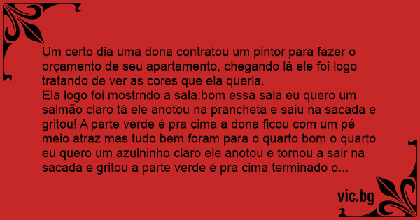 Um certo dia uma dona contratou um pintor para fazer o orçamento de seu apartamento, chegando lá ele foi logo tratando de ver as cores que ela queria.