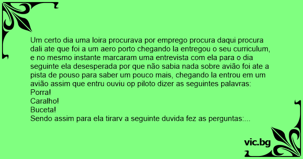 Um certo dia uma loira procurava por emprego procura daqui procura dali ate que foi a um aero porto chegando la entregou o seu curriculum, e no mesmo instante marcaram uma entrevista com ela para o dia seguinte ela desesperada por que não sabia nada sobre avião foi ate a pista de pouso para saber um pouco mais, chegando la entrou em um avião assim que entru ouviu op piloto dizer as seguintes palavras: