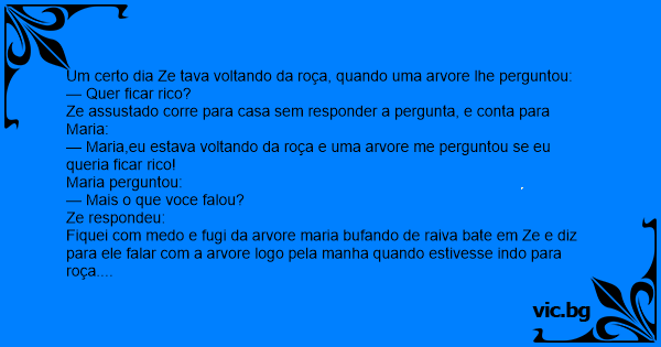 — Maria,eu estava voltando da roça e uma arvore me perguntou se eu queria ficar rico!