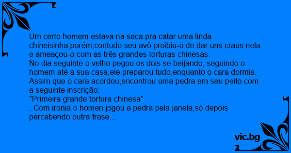 Um homem se perdeu no meio da China. Passou 3 meses dormindo em cavernas e comendo plantas, passando frio e fome. Um belo dia ele avistou no alto de um monte uma enorme casa chinesa. Correu em sua direção e bateu a porta. Abriu-a um senhor chinês de longas barbas brancas que perguntou o que o...
