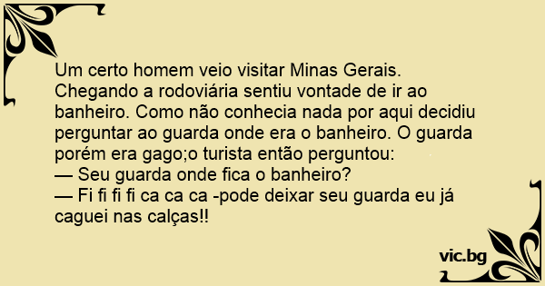 Um certo homem veio visitar Minas Gerais. Chegando a rodoviária sentiu vontade de ir ao banheiro. Como não conhecia nada por aqui decidiu perguntar ao guarda onde era o banheiro. O guarda porém era gago;o turista então perguntou: