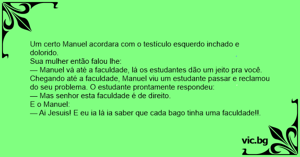 Um certo Manuel acordara com o testículo esquerdo inchado e dolorido. Sua mulher então falou lhe: — Manuel vá até a faculdade, lá os estudantes dão um jeito pra você. Chegando até a faculdade, Manuel viu um estudante passar e reclamou do seu problema. O estudante prontamente respondeu: — Mas senhor esta faculdade é de direito. E o Manuel: — Ai Jesuis! E eu ia lá ia saber que cada bago tinha uma faculdade!!.