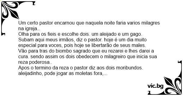 Apos o termino da reza o pastor diz aos dois moribundos. aleijadinho, pode jogar as moletas fora, pois voce já está curado. e de repente ouve-se um forte barulho, bammm. e o pastor pergunta ao gago. o que ouve? e o gago: