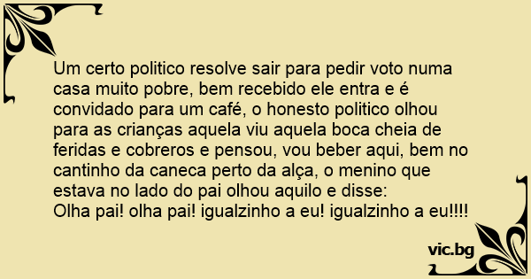 Um certo politico resolve sair para pedir voto numa casa muito pobre, bem recebido ele entra e é convidado para um café, o honesto politico olhou para as crianças aquela viu aquela boca cheia de feridas e cobreros e pensou, vou beber aqui, bem no cantinho da caneca perto da alça, o menino que estava no lado do pai olhou aquilo e disse: