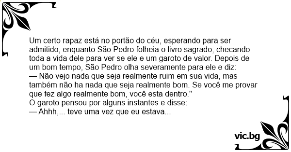 Um certo rapaz está no portão do céu, esperando para ser admitido, enquanto São Pedro folheia o livro sagrado, checando toda a vida dele para ver se ele e um garoto de valor. Depois de um bom tempo, São Pedro olha severamente para ele e diz: