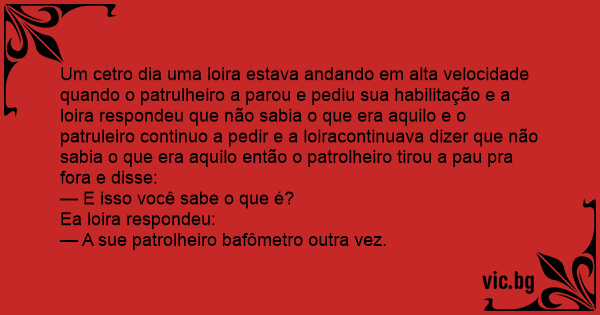 Um cetro dia uma loira estava andando em alta velocidade quando o patrulheiro a parou e pediu sua habilitação e a loira respondeu que não sabia o que era aquilo e o patruleiro continuo a pedir e a loiracontinuava dizer que não sabia o que era aquilo então o patrolheiro tirou a раu pra fora e disse: