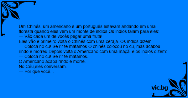 — Coloca no cu! Se rir te matamos O chinês colocou no cu, mas acabou rindo e morreu Depois volta o Americano com uma maçã, e os indios dizem: