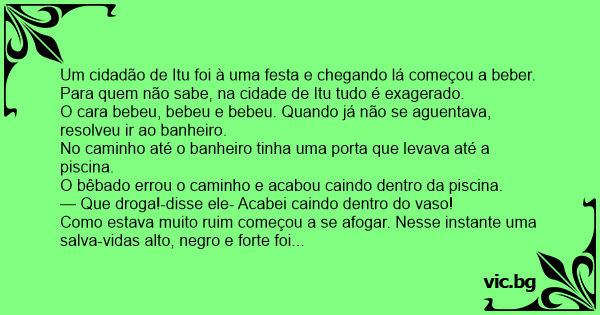 Um cidadão de Itu foi à uma festa e chegando lá começou a beber. Para quem não sabe, na cidade de Itu tudo é exagerado.