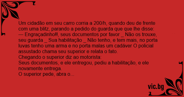 O superior pede, abra o prta luvas, e nada tinha dentro, pede para abrir o porta mala, tambem nada dentro,entao diz o superior assustado: __ Nao estou entendendo nada dizendo ao motorista o que tinha lhe dito o policial.