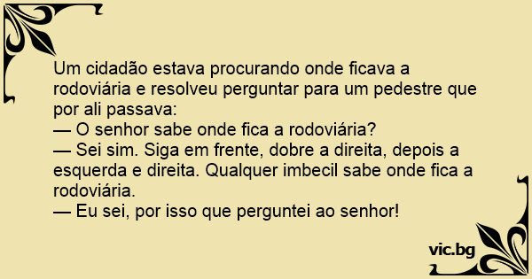 Um cidadão estava procurando onde ficava a rodoviária e resolveu perguntar para um pedestre que por ali passava: — O senhor sabe onde fiса a rodoviária? — Sei sim. Siga em frente, dobre a direita, depois a esquerda e direita. Qualquer imbecil sabe onde fiса a rodoviária. — Eu sei, por isso que perguntei ao senhor!
