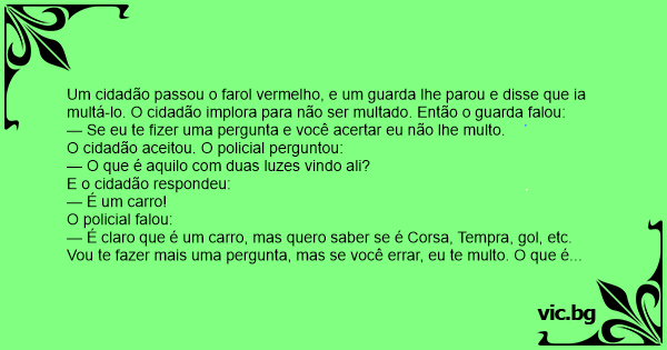— Não! Espere! Se eu te fizer uma pergunta e você acertar você me multa, caso contrario vou embora.