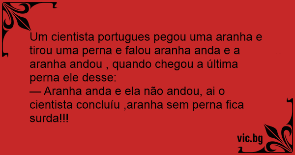 Um cientista portugues pegou uma aranha e tirou uma perna e falou aranha anda e a aranha andou , quando chegou a última perna ele desse: