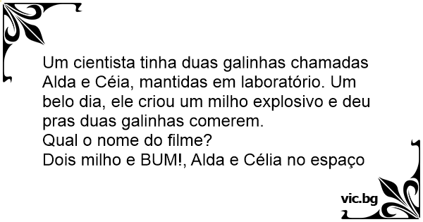 Um cientista tinha duas galinhas chamadas Alda e Céia, mantidas em laboratório. Um belo dia, ele criou um milho explosivo e deu pras duas galinhas comerem.