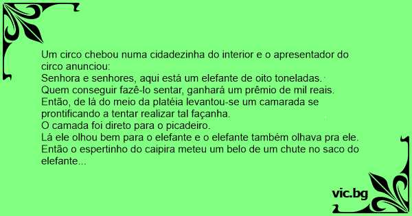 Então o espertinho do caipira meteu um belo de um chute no saco do elefante e não deu outra, o elefante sentou-se na hоrа.