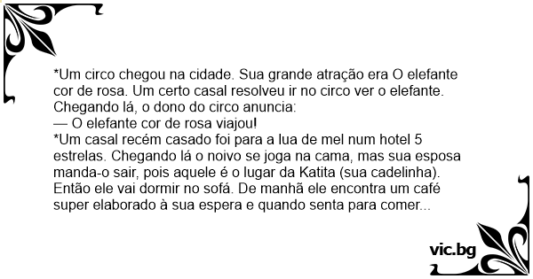 *Um circo chegou na cidade. Sua grande atração era O elefante cor de rosa. Um certo casal resolveu ir no circo ver o elefante. Chegando lá, o dono do circo anuncia: