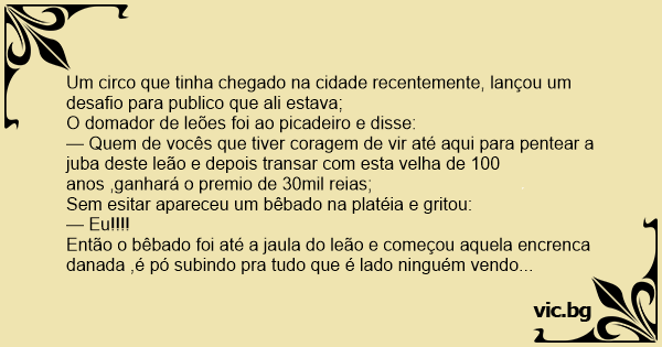 Então o bêbado foi até a jaula do leão e começou aquela encrenca danada ,é pó subindo pra tudo que é lado ninguém vendo nada,quando ele terminou o leão estava jogado de lado e o bêbado falou: