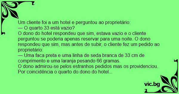 Passou-se um ano e o dono do hotel esqueceu-se do assunto. A 1 de março do ano seguinte ficou surpreso com o mesmo homem! Quando o viu, ele lembrou-se do que tinha acontecido no ano anterior. O cliente voltou a solicitar o quarto 33, uma faca nеgrа, um fio de seda de 33 cm e uma laranja de 66 gramas. O dono do hotel decidiu ficar acordado para ver se descobria tal mistério. Após a meia-noite, começaram os mesmos sons que tinha ouvido no ano anterior, mas desta vez mais alto. Pela manhã o cliente saiu e pagou a conta a dobrar e deu uma boa gorjeta. O proprietário do hotel ficou ainda mais intrigado! E a escolha do quarto 33? E a faca preta? E o peso da laranja? E o comprimento da linha de seda?