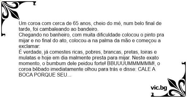 É verdade, já comestes ricas, pobres, brancas, pretas, loiras e mulatas e hoje em dia malmente presta para mijar. Neste exato momento, o bumbum dele peidou forte! BBUUUUMMMMMM!, o coroa bêbado imediatamente olhou para trás e disse: CALE A BOCA PORQUE SEU PASSADO É TRISTE!!