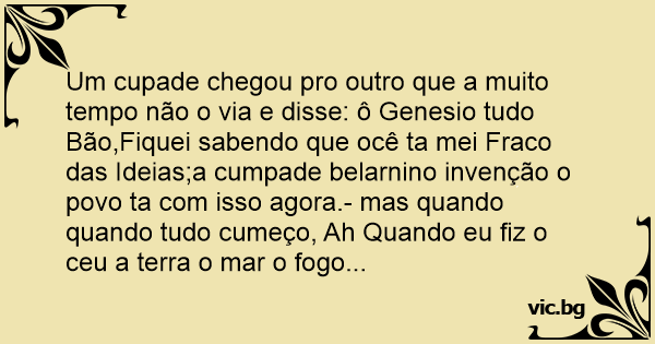 Um cupade chegou pro outro que a muito tempo não o via e disse: ô Genesio tudo Bão,Fiquei sabendo que ocê ta mei Fraco das Ideias;a cumpade belarnino invenção o povo ta com isso agora.- mas quando quando tudo cumeço, Ah Quando eu fiz o ceu a terra o mar o fogo...