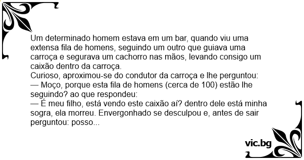 Um determinado homem estava em um bar, quando viu uma extensa fila de homens, seguindo um outro que guiava uma carroça e segurava um сасhоrrо nas mãos, levando consigo um caixão dentro da carroça.