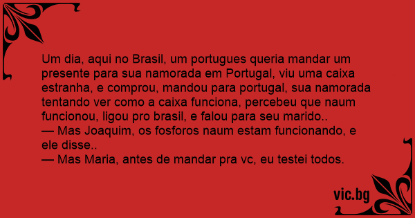 Um dia, aqui no Brasil, um portugues queria mandar um presente para sua namorada em Portugal, viu uma caixa estranha, e comprou, mandou para portugal, sua namorada tentando ver como a caixa funciona, percebeu que naum funcionou, ligou pro brasil, e falou para seu marido..