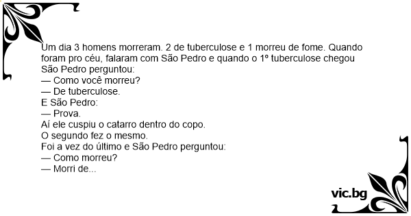Um dia 3 homens morreram. 2 de tuberculose e 1 morreu de fome. Quando foram pro céu, falaram com São Pedro e quando o 1º tuberculose chegou São Pedro perguntou:
