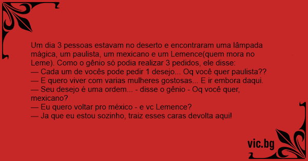 Um dia 3 pessoas estavam no deserto e encontraram uma lâmpada mágica, um paulista, um mexicano e um Lemence(quem mora no Leme). Como o gênio só podia realizar 3 pedidos, ele disse: