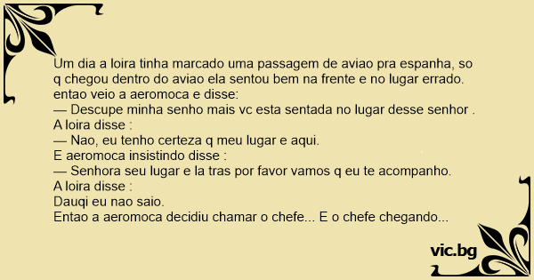Um dia a loira tinha marcado uma passagem de aviao pra espanha, so q chegou dentro do aviao ela sentou bem na frente e no lugar errado. entao veio a aeromoca e disse: