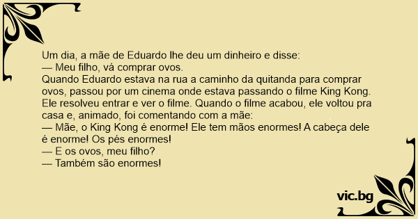 Quando Eduardo estava na rua a caminho da quitanda para comprar ovos, passou por um cinema onde estava passando o filme King Kong. Ele resolveu entrar e ver o filme. Quando o filme acabou, ele voltou pra casa e, animado, foi comentando com a mãe:
